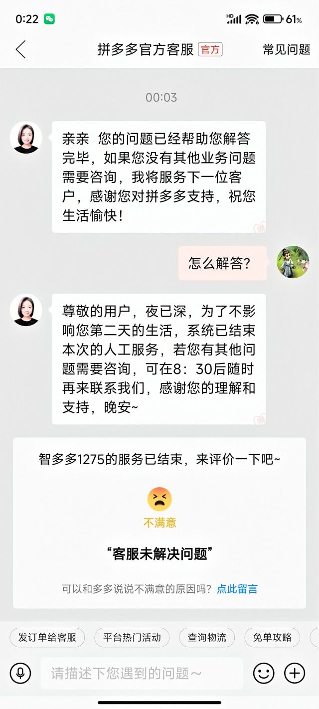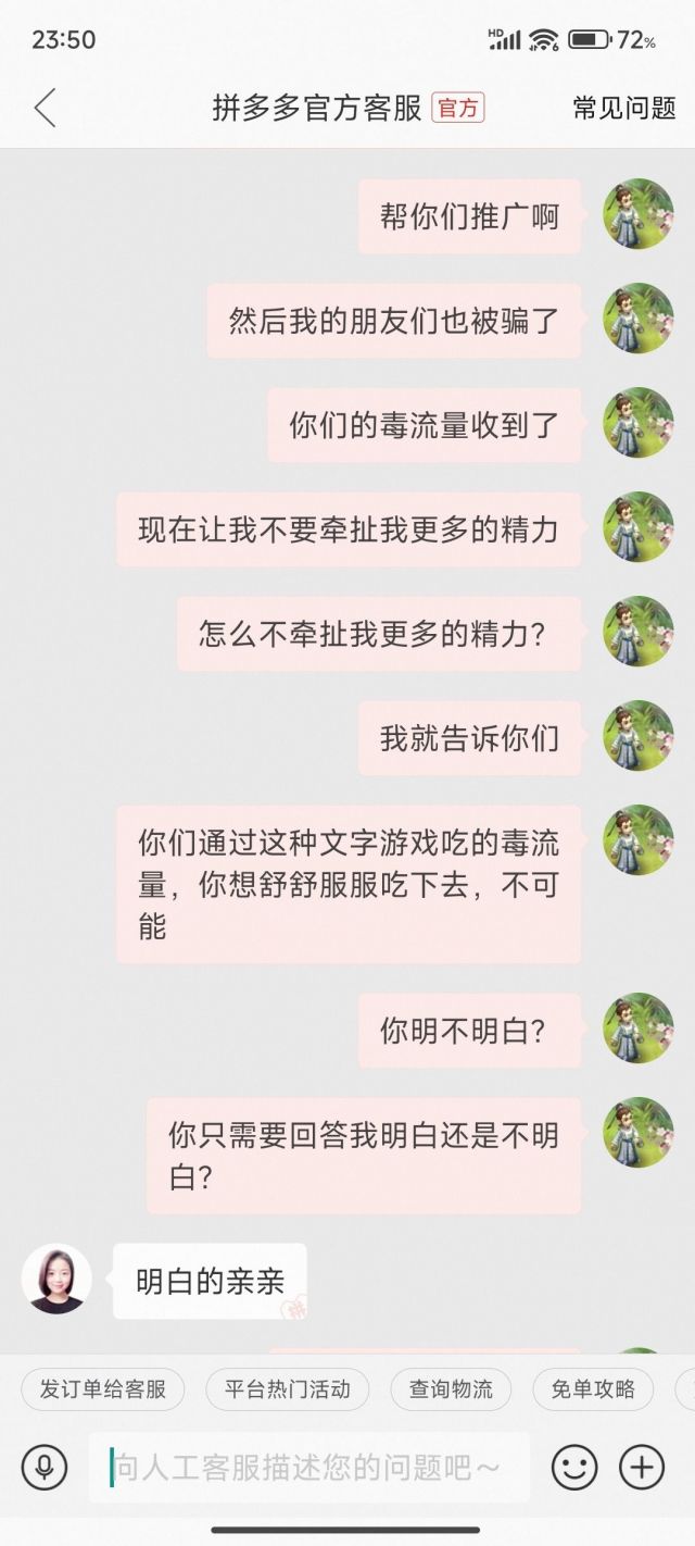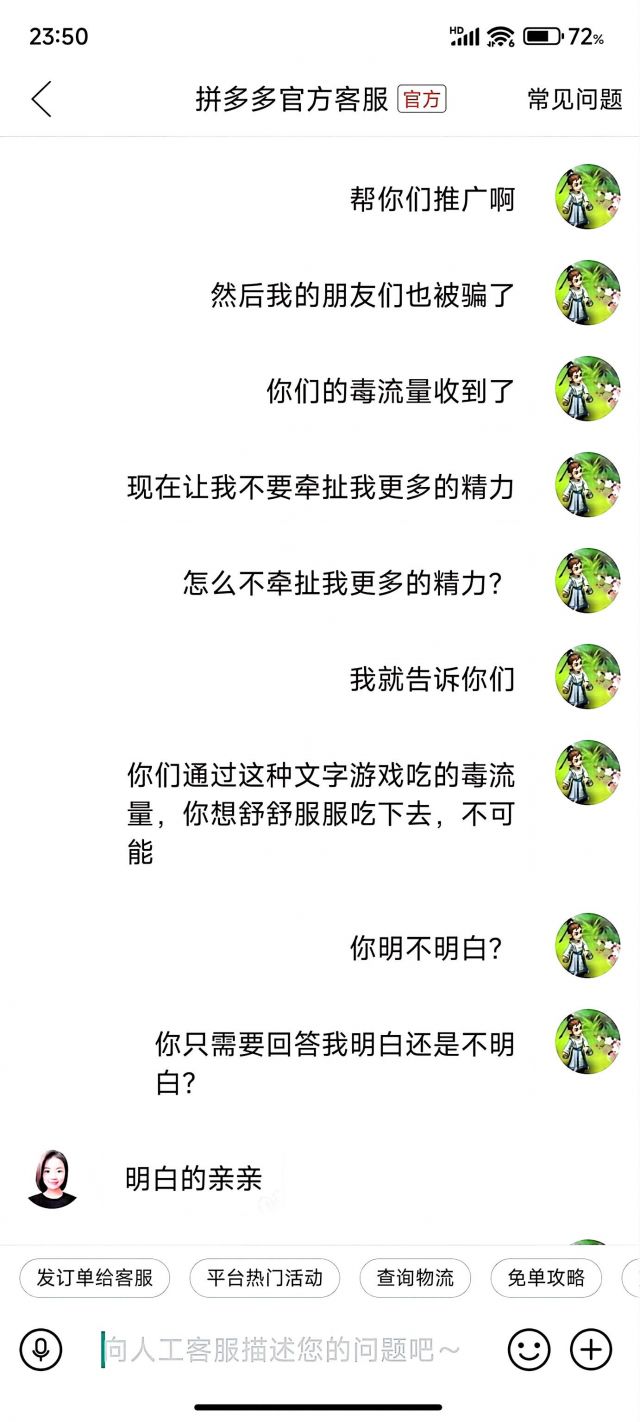 本人于2024年10月31日晚参加拼多多活动,被活动欺骗后,向客服反应,拼多多客服表示明白这个活动就是靠文字游戏吃毒流量,也表示明白在出了京东的事情后,没法把这个度流量舒舒服服的吃下去。因为水温过高,拼多多客服连夜跑路。