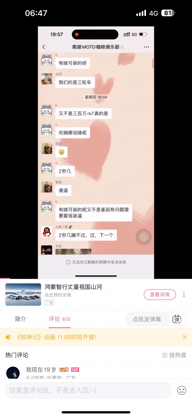 小米车主破防就像七点后那里开始,群里都在责怪他拿电车来比加速是在装逼, 这个时候换成一个正常人大概率的选择就是融入不进圈子自己退群了,不然留下来说再多都成小丑了,你不可能靠武力把每个人打服。