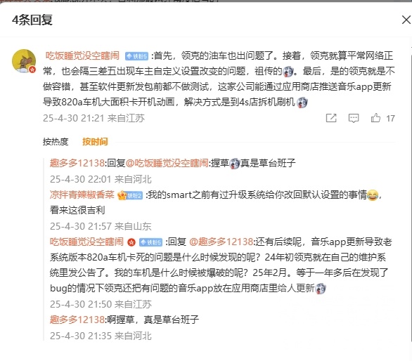总结:领克这帮活爹,APP没做服务端容错设计,导致网络波动出现用户数据错乱,A车主的信息设置,登录应用到了B车主的车上,离谱