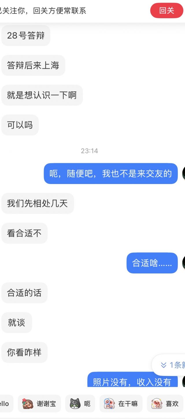 之前在红书上发了相亲贴挂了一个多月了吧,今天突然遇到个主页空白的捞女跑来撩,一看就是图谋不轨,最后说得对面直接破防急了