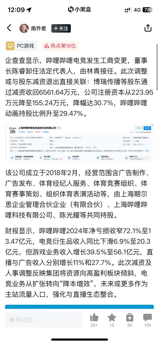 企查查显示,哔哩哔哩电竞发生工商变更,董事长陈睿卸任法定代表人,由林青接任。此次调整或与股东减资退出直接关联:博瑞传播等股东通过减资收回6561.64万元,公司注册资本从223.95万元降至155.24万元,降幅达30.7%,哔哩哔哩动画持股比例升至29.47%。