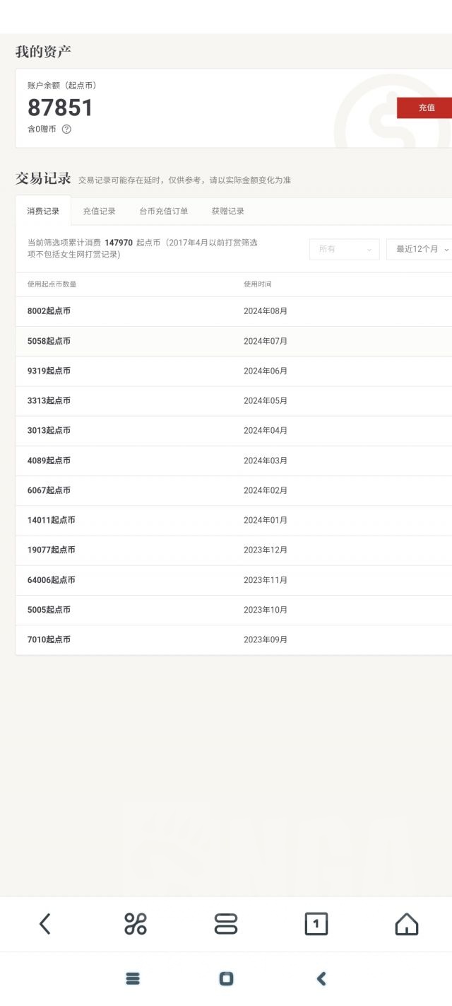 从初中开始看小说,看到现在33岁了,从盗版到现在的看正版,今天心血来潮想查查近几年在起点花的钱,一看充值记录,好家伙,前些年稳定在500左右,21快上1000了
