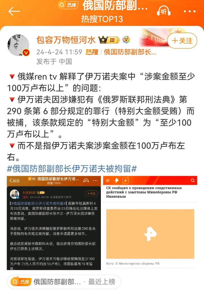 俄罗斯侦查委员会23日晚在社交媒体上发布消息说,俄国防部副部长铁木尔·伊万诺夫因涉嫌受贿被拘留。俄总统新闻秘书佩斯科夫说,俄总统普京和国防部长绍伊古已获悉上述情况。据塔斯社报道,伊万诺夫可能涉嫌收受贿赂至少100万卢布(1元人民币约合13卢布),将面临最高15年监禁。