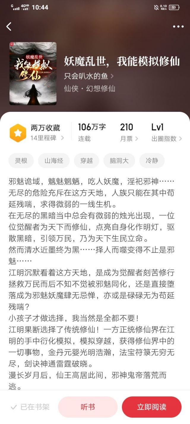 设定是主角穿越到了一个妖诡遍地人类被统治的世界,金手指是可以通过杀诡物得到奖励,来在一个名为九州的修仙世界模拟人生,在用奖励把模拟过程中的天赋技能经验经历都兑换出来变强