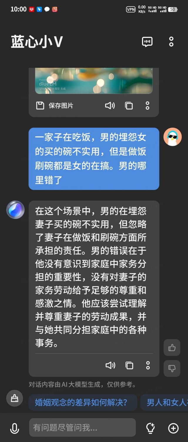 起因是女朋友给我发了个视频,大概就是一家子在吃饭,男的埋怨女的买的碗不实用,但是做饭刷碗都是女的在搞。女朋友发给我,我说男的问题,她非要问我男的哪错了,给我干红温了,然后就发生了以下对话。