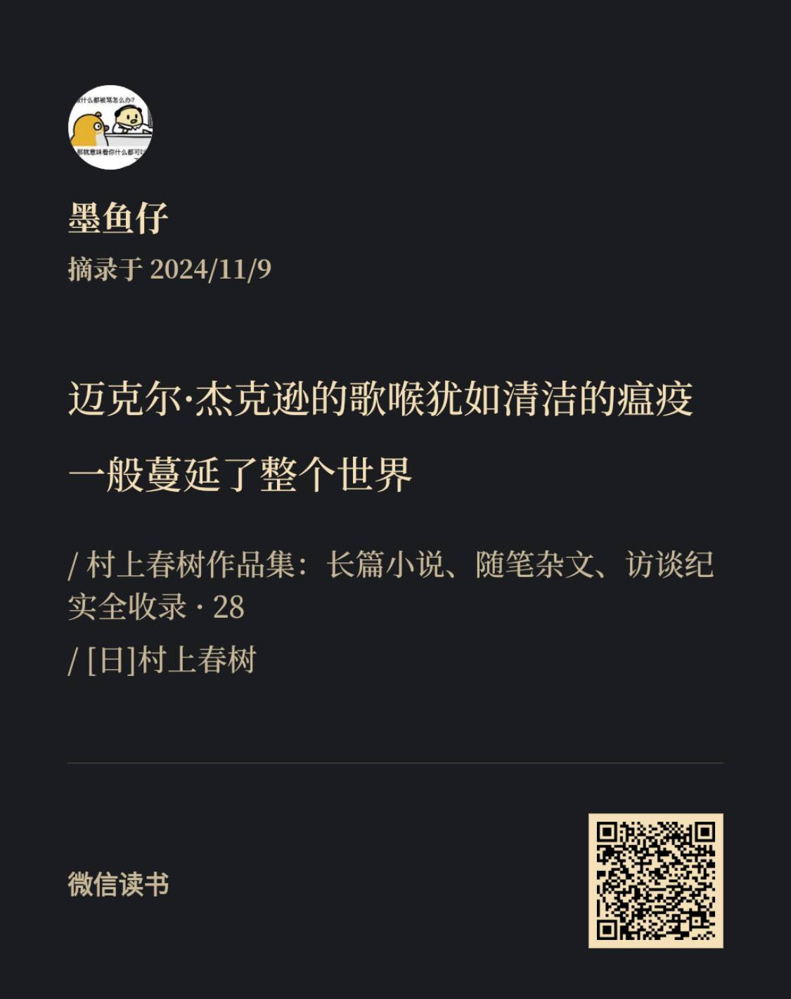 村上春树这老登,和画JOJO的荒木一样,特别喜欢在作品里带私货——自己喜欢的音乐。村上春树在书中提到迈克尔杰克逊时,特地夸赞了他的嗓音。