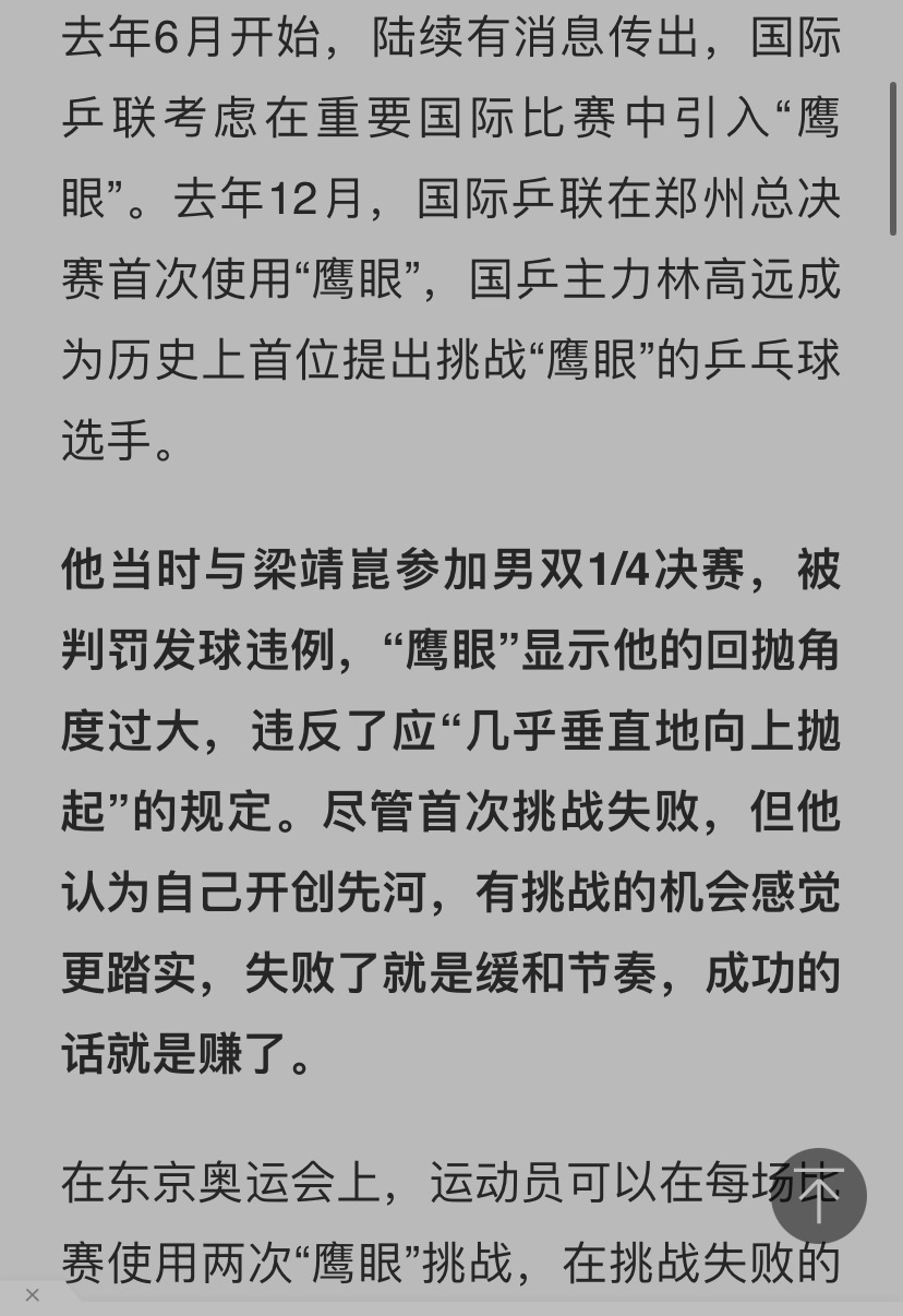 看着很多运动很早以前就开始用了,我看了看网上的信息,乒乓球也在好多年以前也提出引进了鹰眼了,至少在2019年就有相关消息了。我还看到一篇以前的文章说啥当初日本想要在东奥之前就引进,咋国际乒联今年才决定在25年才启用?这种提升竞技公平性的东西不好吗?
