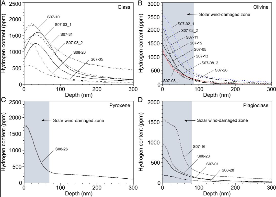 针对不同矿物,他们继续由表及里,利用纳米离子探针,结合最新研发的超高空间分辨的深度剖面分析技术,分析了氢及同位素的含量。结果显示,斜长石、辉石等表面有太阳风损伤的矿物,其氢元素含量也大致集中在损伤区域(下图为灰色),在矿物内部越深的区域,氢元素含量越少。到了矿物表面300nm以下,几乎氢元素含量趋于稳定。