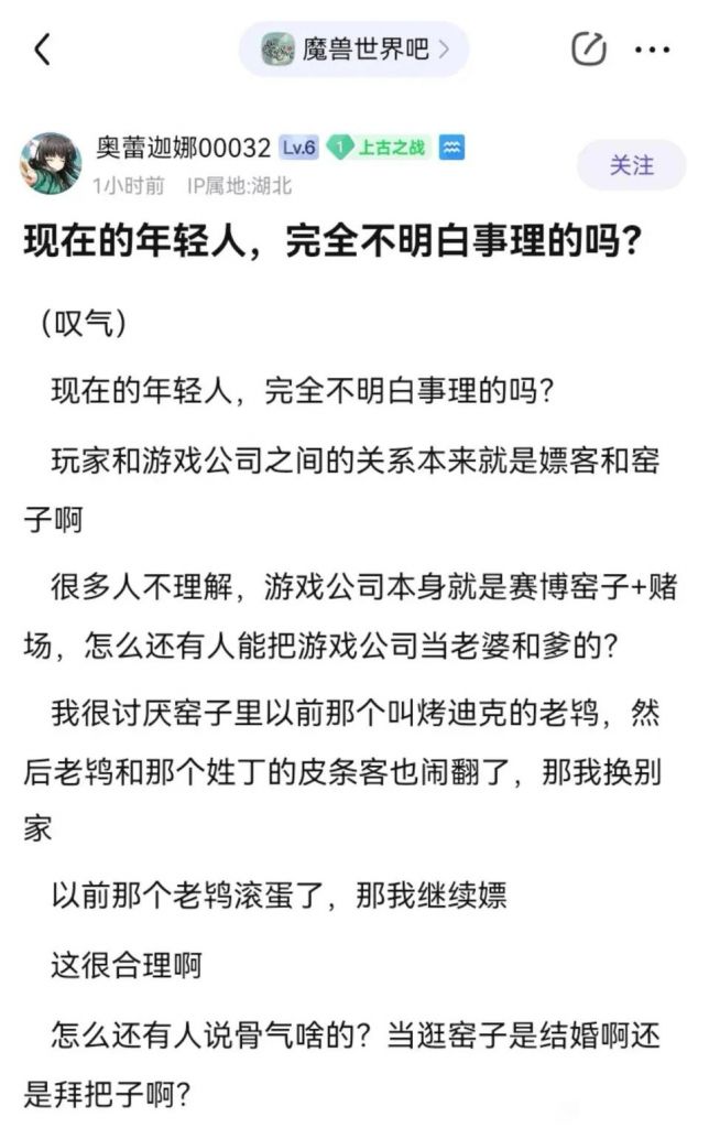 看到好多骂楼主的,首先图是群里看的。其次楼主现在是steam玩家,网游只玩dota。曾经是暴雪全家桶玩家,魔兽是点卡换月卡a的,看签名可以知道;炉石氪过几千,暴雪走的时候一分没退;星际曾经一年每周通关突变疯狂,买了所有指挥官,暴雪走的时候也没退;d3、守望先锋当年都是第一时间入坑的;目前是坚定的暴黑。也没觉得魔兽是自己的老婆,但是对我来我魔兽的那个号,是我毕生的回忆。暴雪在我眼里,真的恶心。
