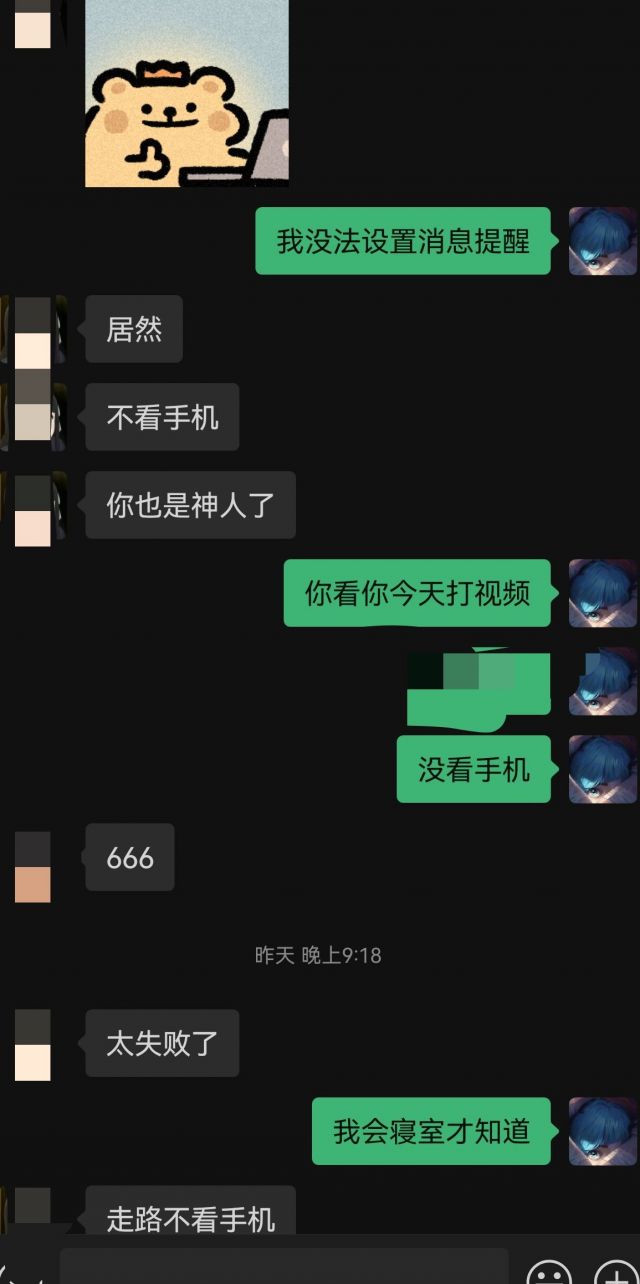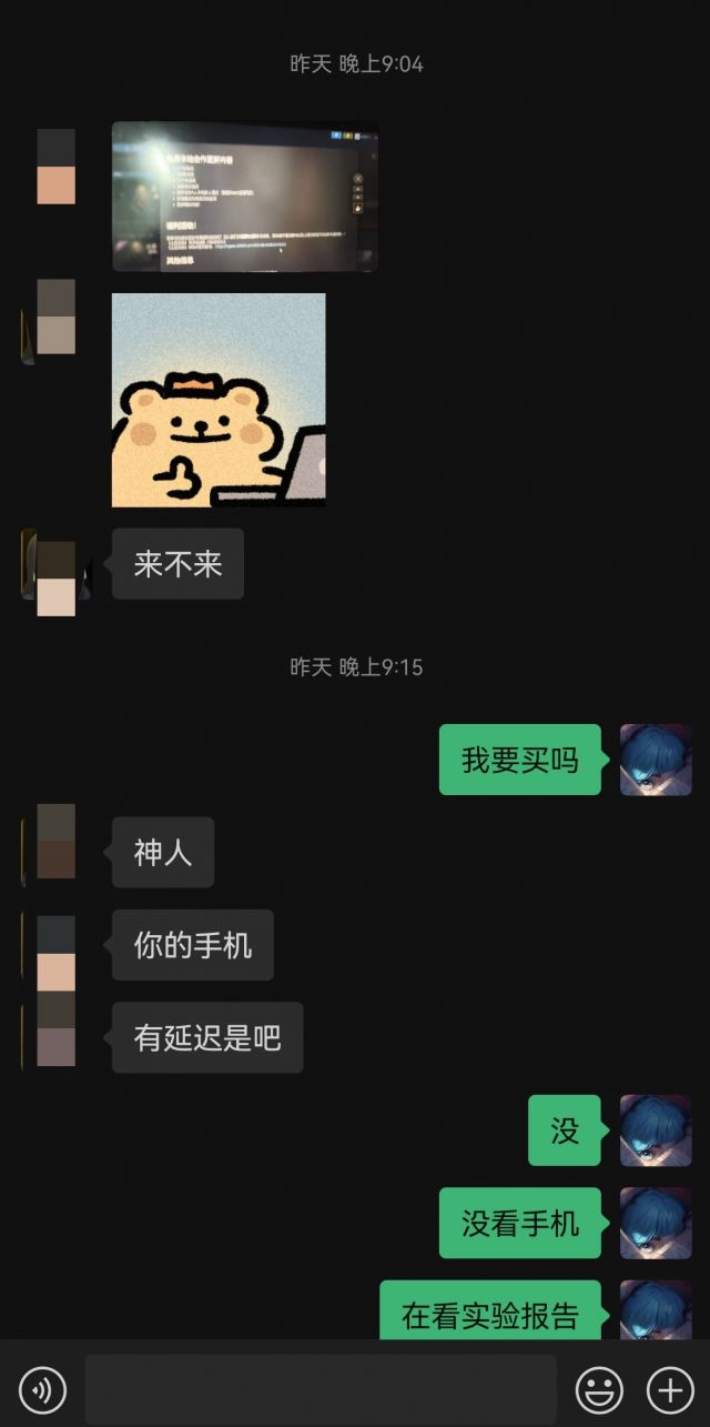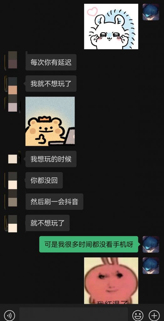 对方是高中同学,现在都已经大三了,我自认为跟我们是很好的朋友,但这件事让我有点伤心😔,先是他视频(应该是找我玩游戏),我没看手机,看见后就回拨了,然后对面秒拒(我以为他有什么事,没在意)然后后面又一次没看,然后发生以下对话,大概对话就到9点多钟结束后没发消息,11点我登英雄联盟领个奖励,发现他在跟别人(网友)双排大乱斗,然后就开始不受控制的意淫(我找你打游戏就没兴致,网友找你就有兴致,我叫你不来没关系,你打的时候问下我都不愿意,摆明就不想跟我玩呗....)我觉得我受自己主观情绪影响了,发出来好受些,顺便问一下谭友怎么看