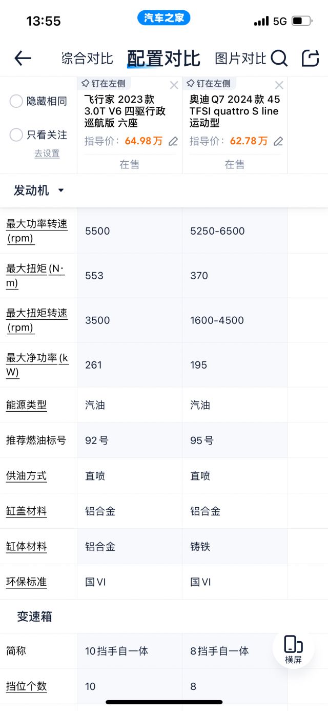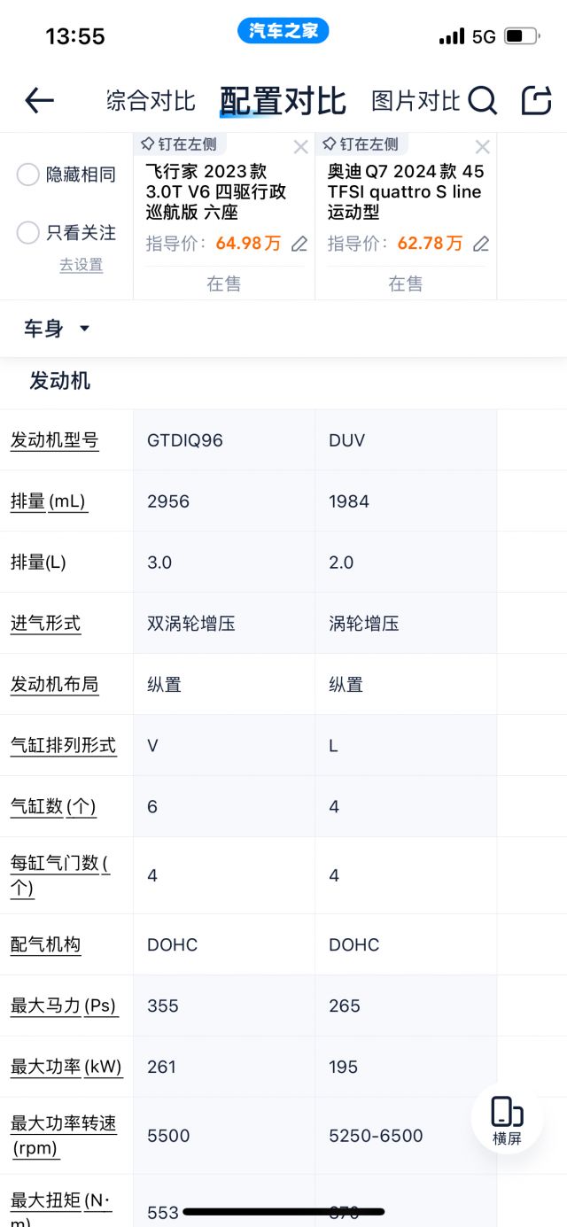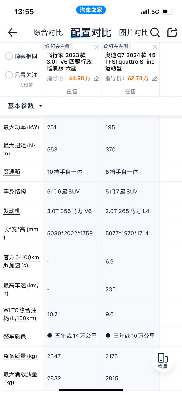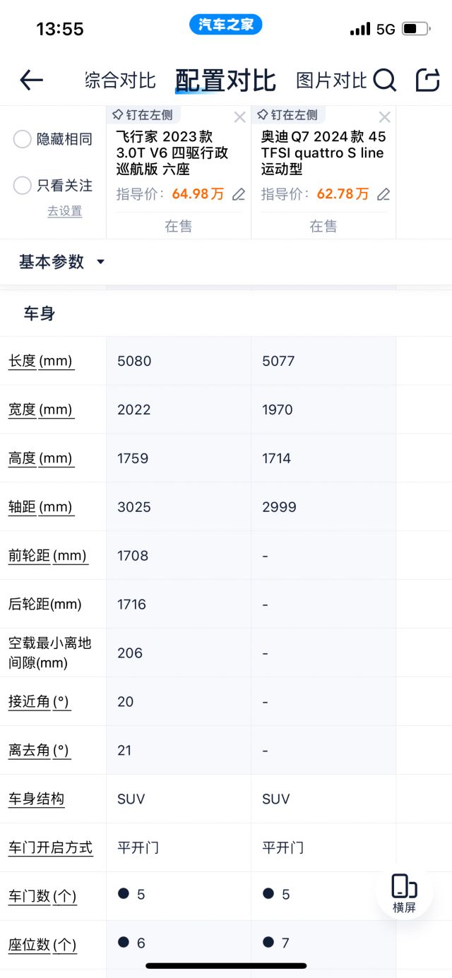 奥迪Q7.24款45运动型7座和飞行家23款3.0V6尊雅怎么选,我感觉差不多。刚需6座或者7座都可以。Q7的55型V6超预算,是真口水。GLC家人提起过,不过同事有开的,再说开了奔驰更好的车型也就那样,对奔驰没什么好映像。自己对BbA没有商务要求,就是纯家用,平时开的也不多,出去基本就是一家人出去玩。电车已有,媳妇开,所以不会再买电车,这次就想换个好点的油车。