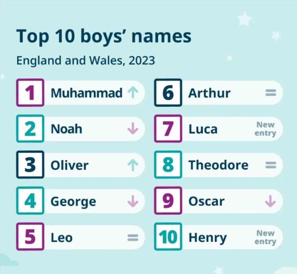 去年英国新生男婴排名第一的名字是穆罕默德,这是一个非常有宗教色彩的名字。