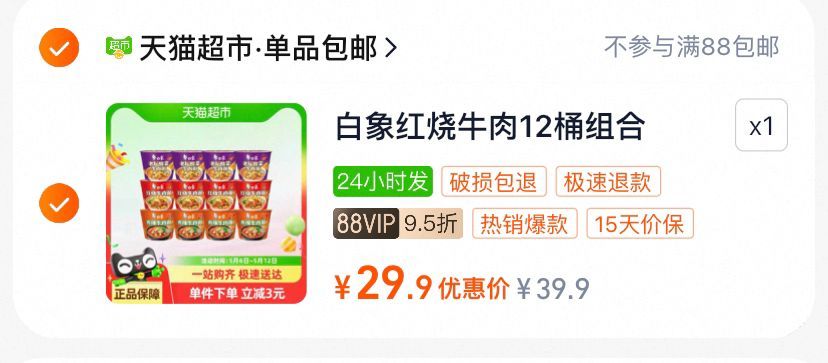 [猫超]白象方便面经典桶装3口味组合装12桶29.9元