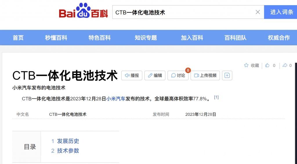 百度上看CTB已经是小米的了,小米自研电池成功吊打宁德时代和比亚迪