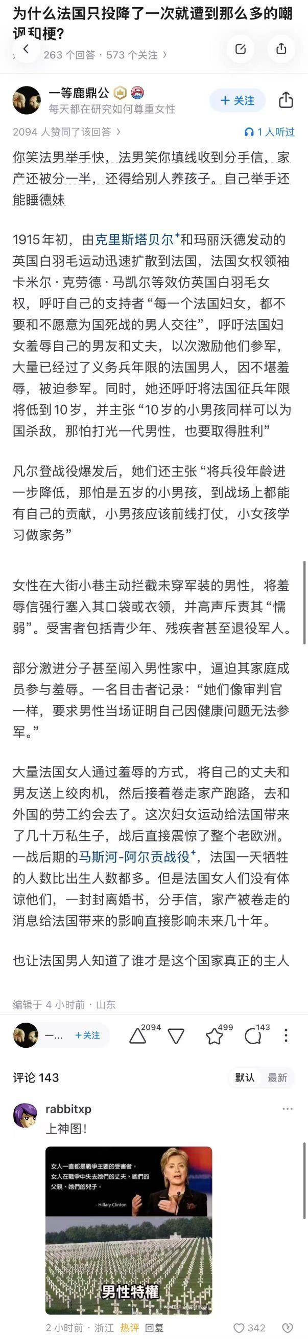 大量法国女人通过羞辱的方式,将自己的丈夫和男友送上绞肉机,然后接着卷走家产跑路,去和外国的劳工约会去了。这次妇女运动给法国带来了几十万私生子,战后直接震惊了整个老欧洲。一战后期的马斯河-阿尔贡战役,法国一天牺牲的人数比出生人数都多。但是法国女人们没有体谅他们,一封封离婚书,分手信,家产被卷走的消息给法国带来的影响直接影响未来几十年。