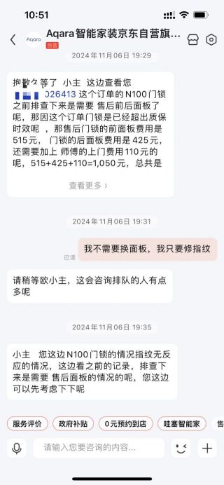 京东买的aqara智能锁,能连米家和homekit的版本。刚过保指纹用不了了,电池拔了重启能恢复,半天后又失灵,联系客服,告知只能维修前后面板,加上门费用1050,我智能锁买来才900多,而且商品详情页上写的很清楚中修费用110,小修费用60,这售后感觉像吃了苍蝇一样恶心。