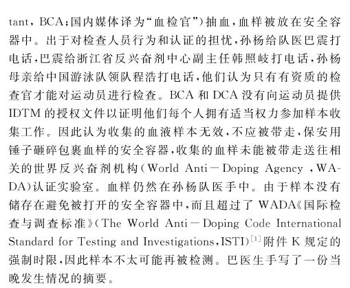 而最引人注目的“暴力”情节,反而并没那么重要,因为如果样品是非法取得的,那么其实怎么拿走都无所谓,撑死了涉及一些财产纠纷。更何况,孙杨在进行该行为前,是取得了领导批准的,至少是听取了专家意见的。因此即便该行为不妥当,也不能视为孙杨的个人行为,他只是在执行集体决定。