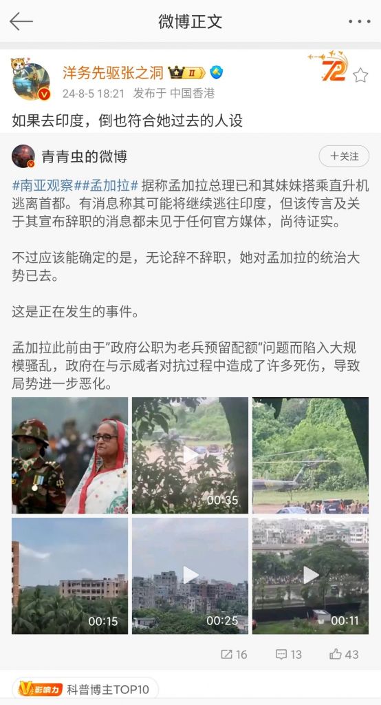据路透社报道,援引孟加拉陆军及驻印大使馆相关人士的话称,该国总理哈西娜已辞职且离开了该国。