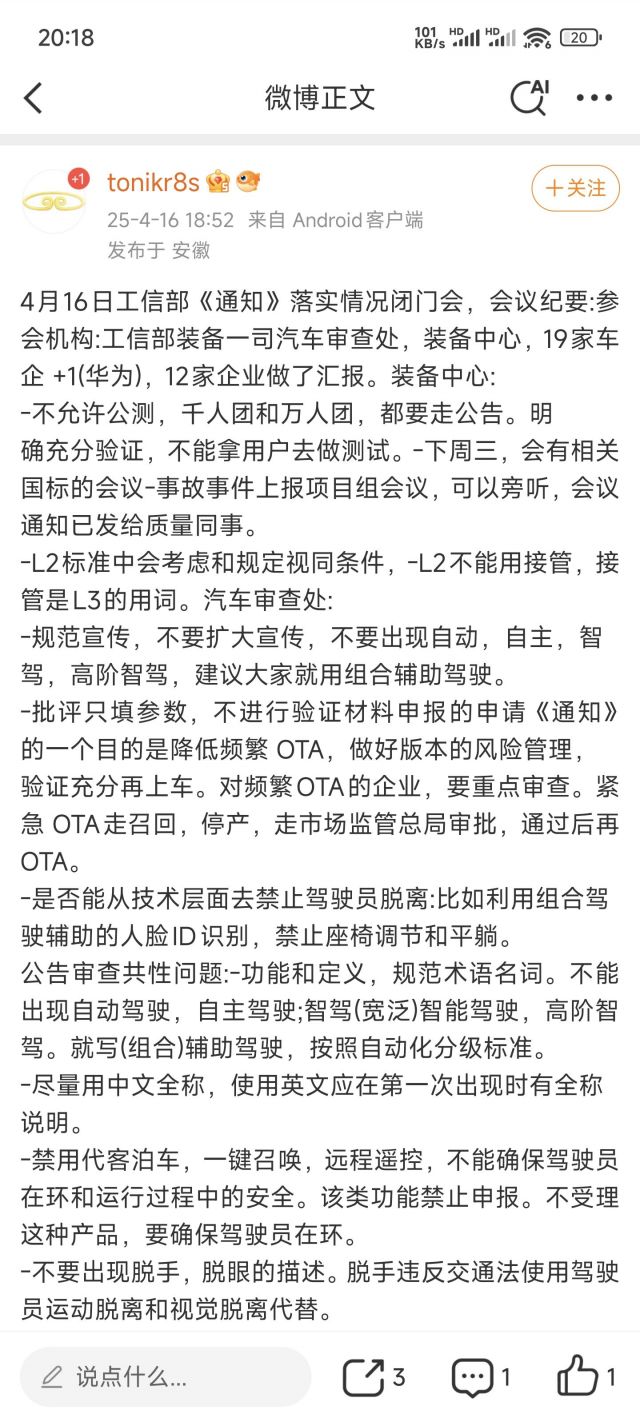 会议强调,汽车生产企业要深刻领会《通知》要求,充分开展组合驾驶辅助测试验证,明确系统功能边界和安全响应措施,不得进行夸大和虚假宣传,严格履行告知义务,切实担负起生产一致性和质量安全主体责任,切实提升智能网联汽车产品安全水平。