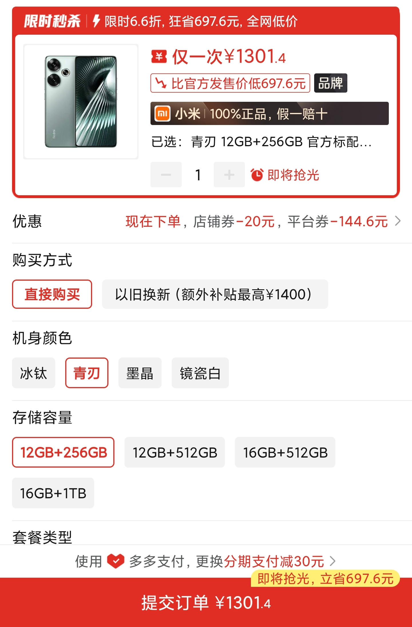 最后我选择了redmi tubur 3,刚下完单拼夕夕马上给了我双12 1000-100的优惠券。放平常这卷我一眼都不会看,但我却惊奇的发现,这卷能用到我刚买的手机上去。