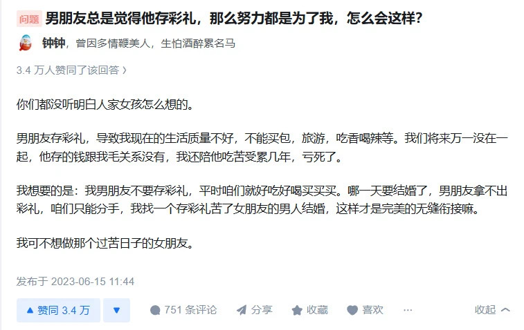 我就直接发问。如果在合法婚姻的前提下,你老公的钱是不是你的钱?你老公的债务是不是你的债务?钱多的男人你根本不敢跟他说彩礼,因为你怕他不要你。穷的男人,给不起彩礼,硬上要负债。如果人家为了给彩礼欠了一屁股债,这样你结婚后会好过?
