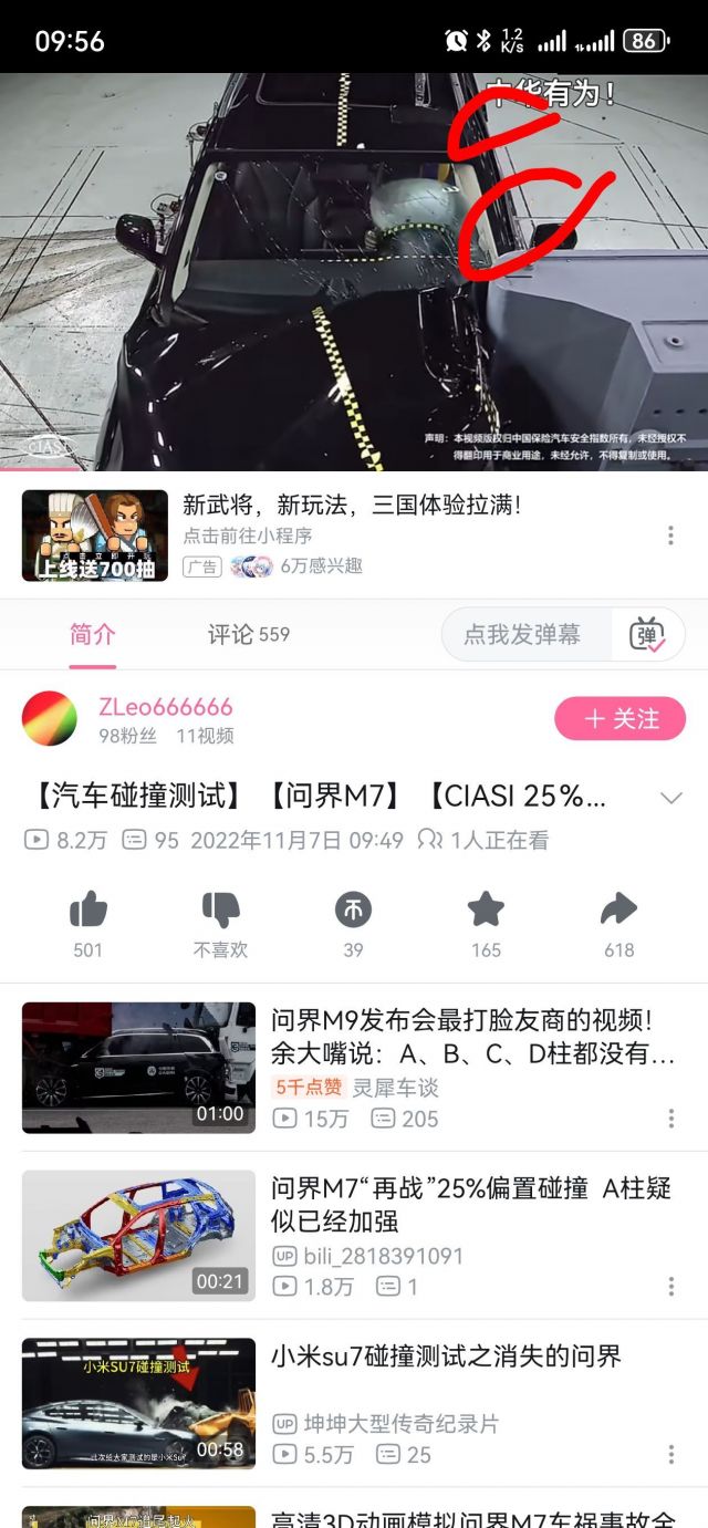 ,附上视频链接。[[汽车碰撞测试][问界M7][CIASI 25%偏置碰撞]后A柱近况-哔哩哔哩] [https://b23.tv/BnD0dFd https://b23.tv/BnD0dFd]▸
