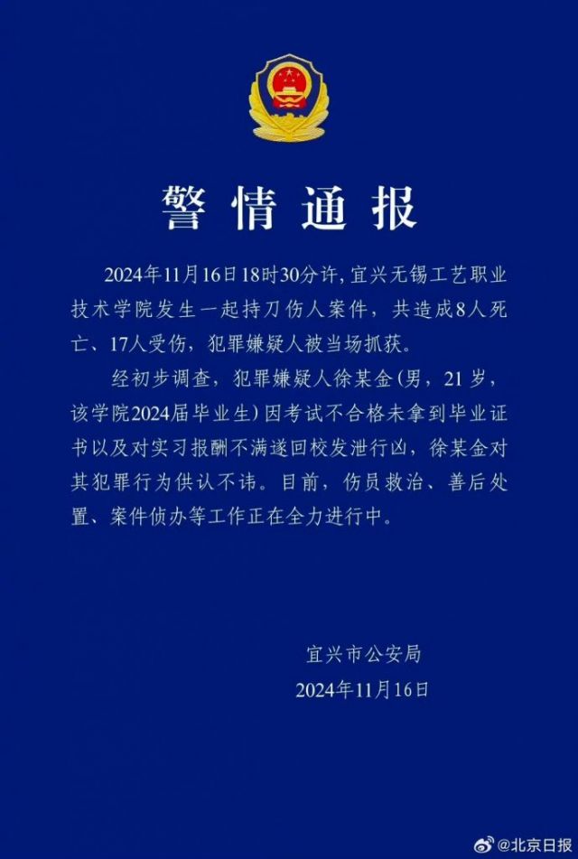 [#无锡持刀伤人案致8死17伤#]#警方通报无锡持刀伤人案# 2024年11月16日18时30分许,宜兴无锡工艺职业技术学院发生一起持刀伤人案件,共造成8人死亡、17人受伤,犯罪嫌疑人被当场抓获。