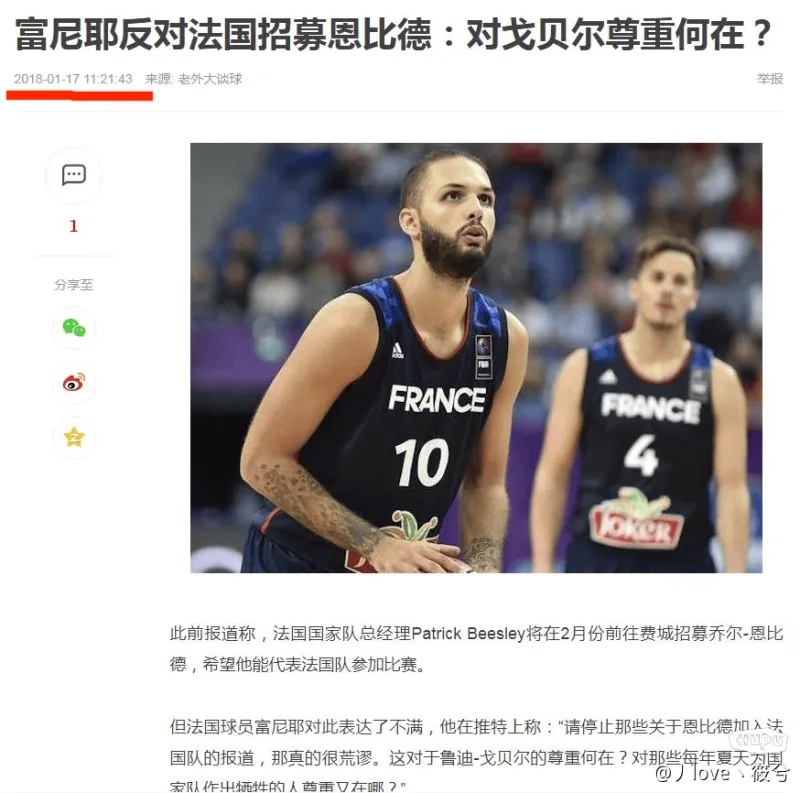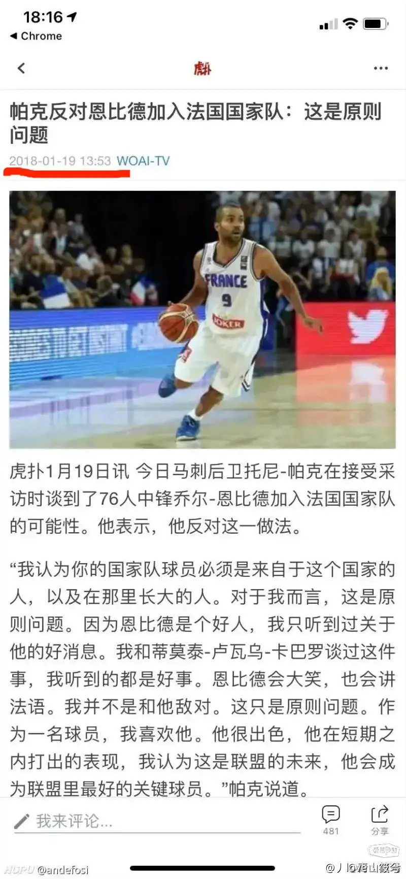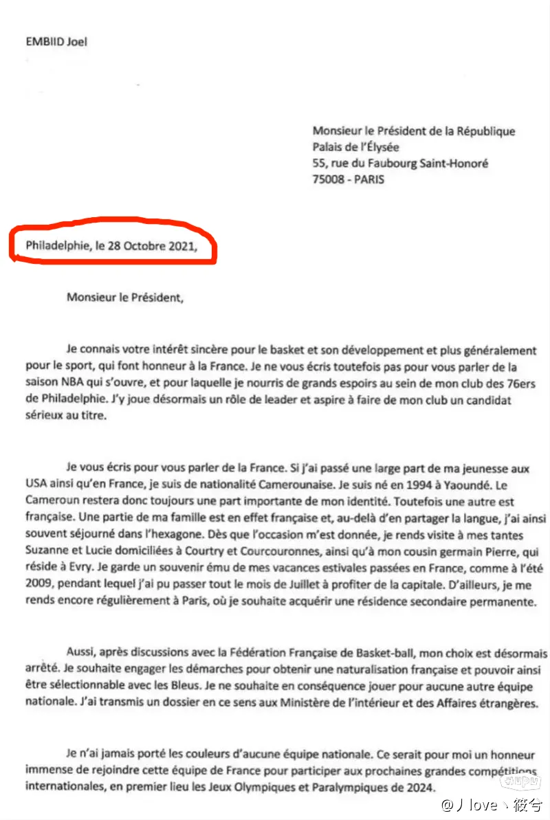而在今日,欧洲媒体Eurohoops曝光了恩比德2021年致法国总统马克龙的一封私人信件。恩比德在信中表示:“在与法国篮协讨论后,我已经做出了选择。我希望采取措施获得法国国籍,从而能够入选法国队。因此,我不希望为任何其他国家队效力。我从来没有穿过任何国家队的球衣。我非常荣幸能加入法国队参加接下来的重大国际比赛,首先是2024年奥运会和残奥会。”