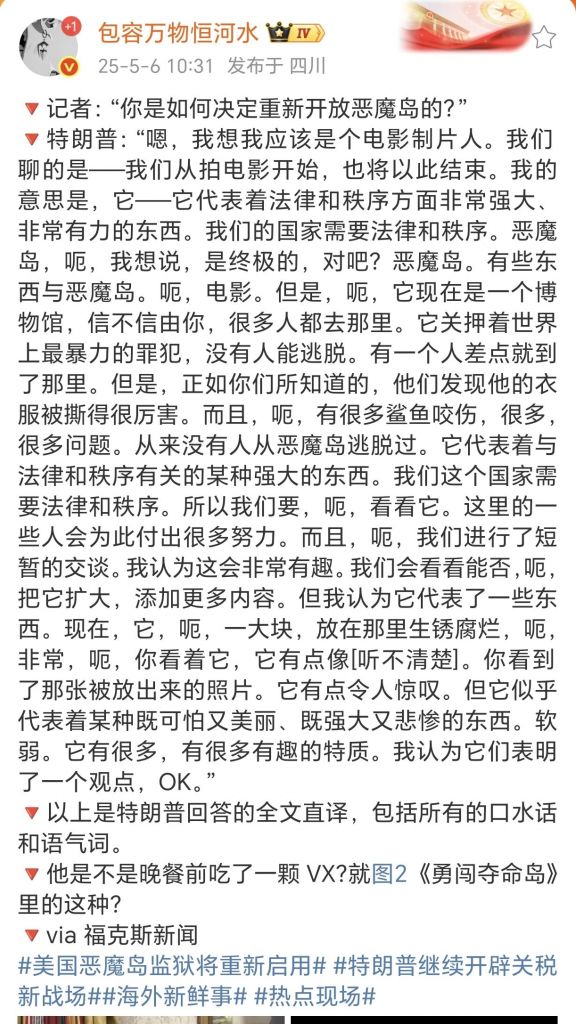 懂王:恶魔岛是,呃,我会说是终极的,对吧?“Alcatraz is, uh, I would say the ultimate, right? ”