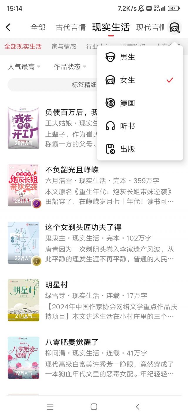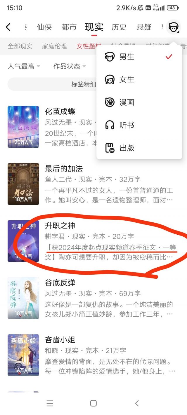请问你们知不知道男频的现实分类里有女性题材这一分类