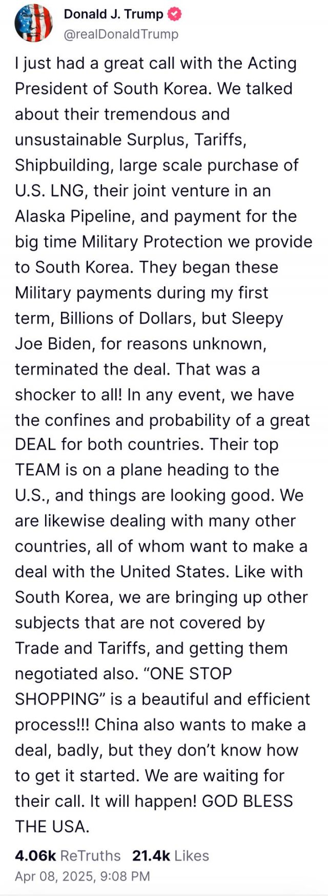 我刚刚与韩国代总统进行了一次非常愉快的通话。我们讨论了韩国巨额且不可持续的贸易顺差、关税问题、造船业、大规模采购美国液化天然气、双方在阿拉斯加管道项目的合资企业,以及韩国为美国提供的重大军事保护支付费用等议题。这些军事费用支付始于我的第一个任期,金额高达数十亿美元,但昏昏欲睡的乔·拜登却莫名其妙地终止了协议,令所有人震惊!无论如何,我们正在探讨一项对两国都有利的重大协议框架。韩国的顶级谈判团队已乘专机赴美,形势看起来非常乐观。我们同时也在与许多其他国家磋商,他们都渴望与美国达成协议。就像与韩国谈判一样,我们正在提出贸易和关税之外的其他议题,并推动这些议题的协商。"一站式谈判"真是个高效又完美的流程!!!中国也非常迫切地想达成协议,但他们不知如何着手。我们正在等他们的电话。这事一定能成!上帝保佑美国。