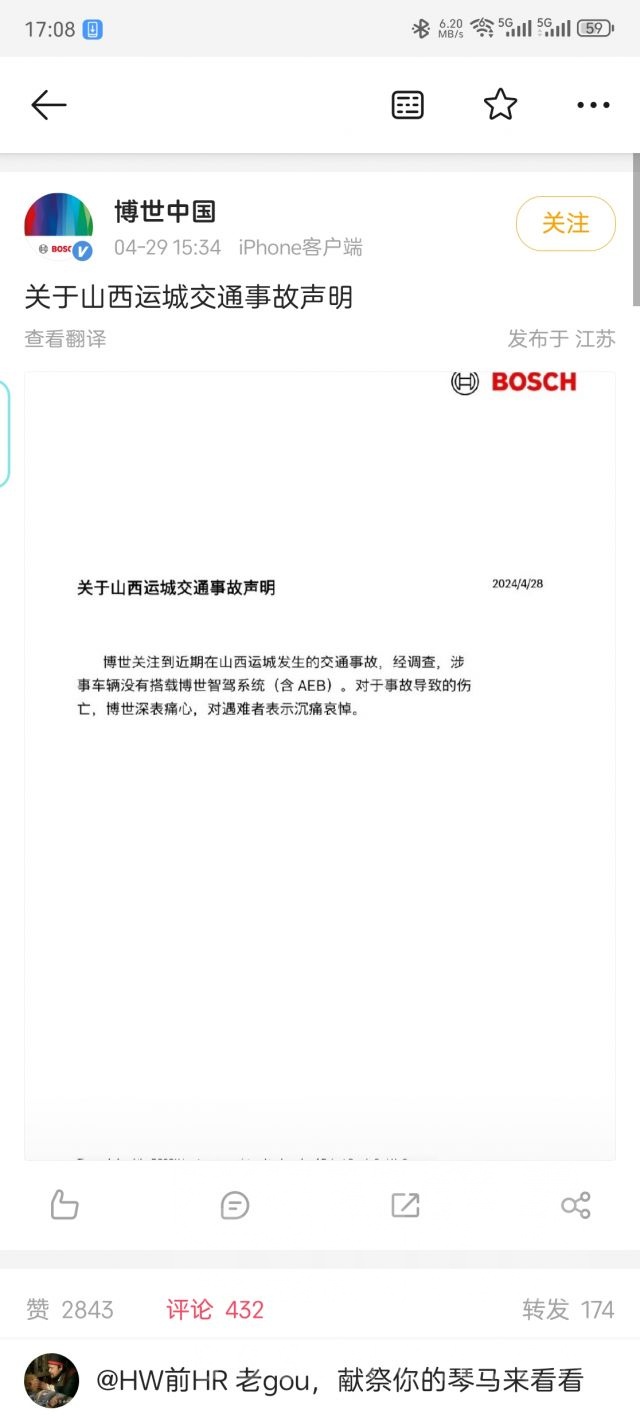 hw前hr笑话一则。某知名华系kol在问界事故第一时间甩锅博世,在博世发公告以后迅速编辑,只能说还好博世澄清的快啊,不然就被这丧良心的kol甩到锅了。