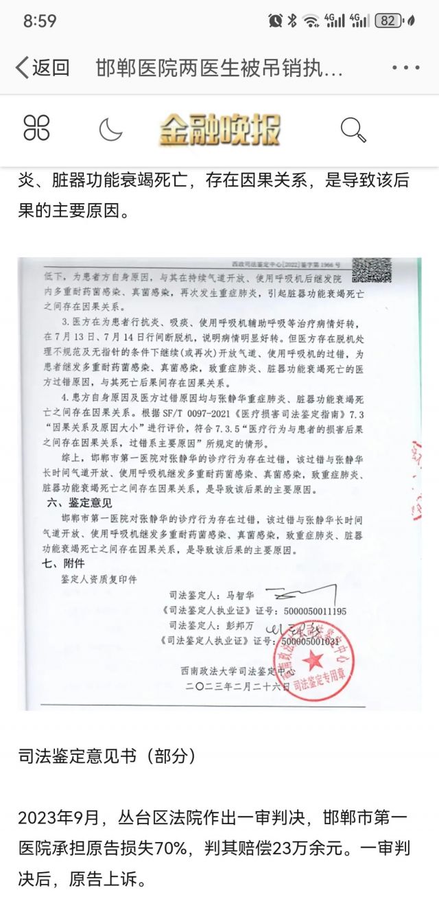 但打赢了官司,患者家属并未就此罢休。在法院判决生效并执行后,家属继续向邯郸市卫健部门举报郭瑞霞和闫秀萍,直到近日两人被吊销医师执业证书。