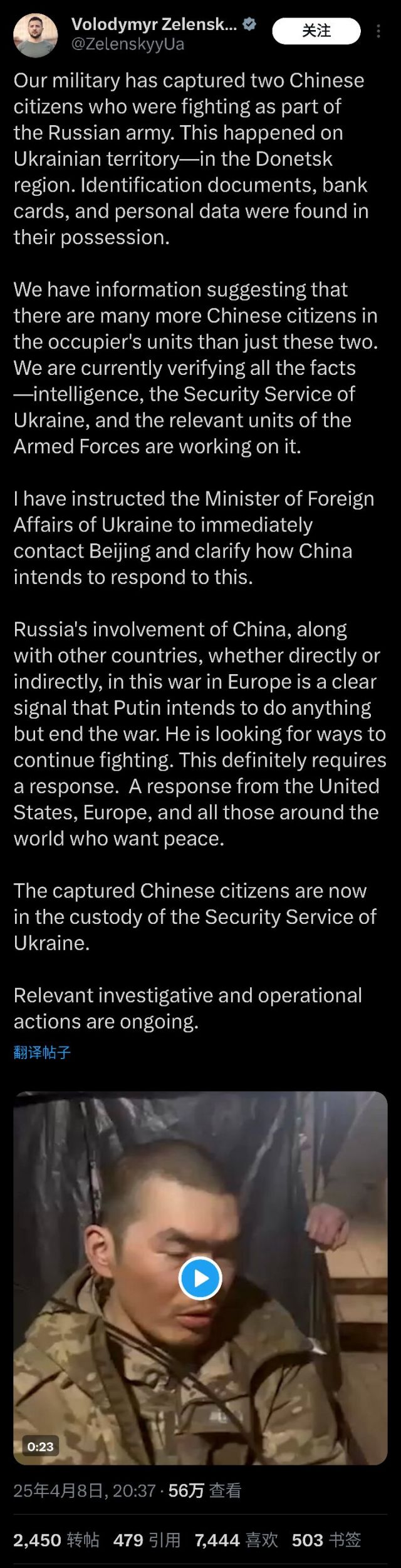 我们掌握的信息表明,在占领军部队中的中国公民远不止这两人。目前我们正在核实所有事实——情报部门、乌克兰安全局以及武装力量相关部队正在处理此事。