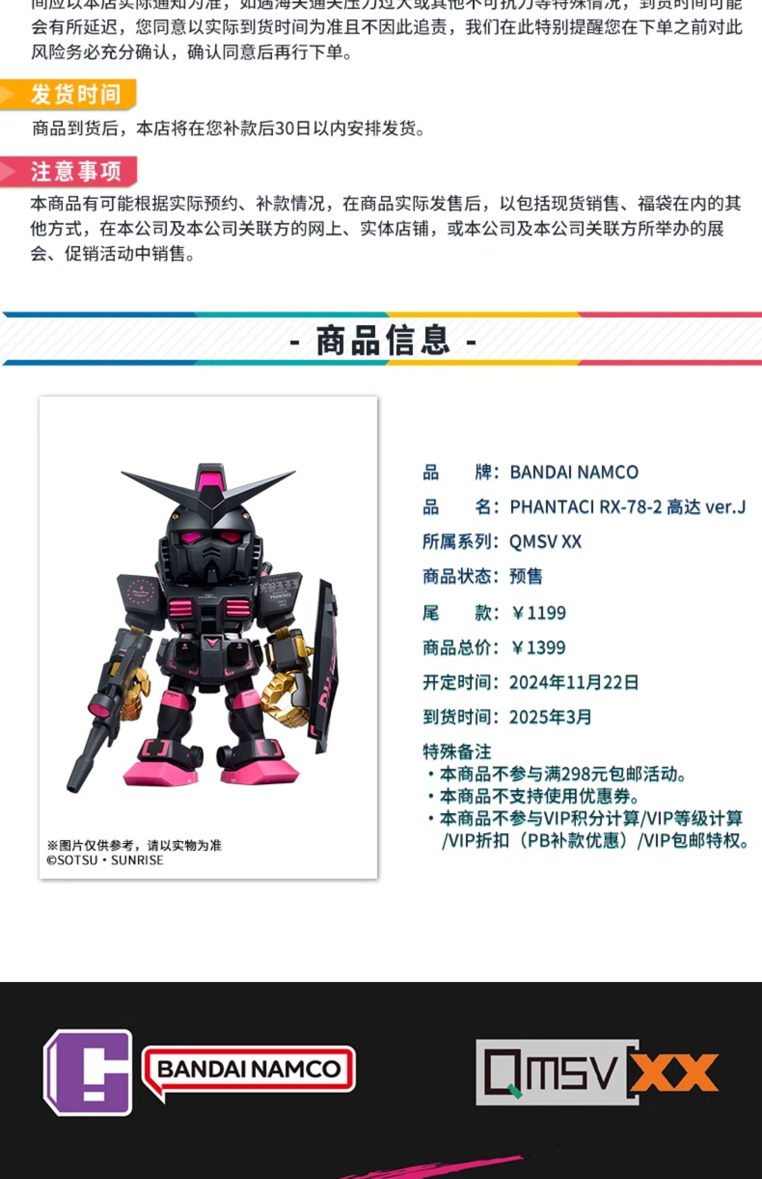由 万代南梦宫 出品的 QMSV XX PHANTACI RX-78-2 高达 ver.J ,全高约 40cm,材质为 PVC&ABS,售价 1399 元,预计 25 年 3 月发售。