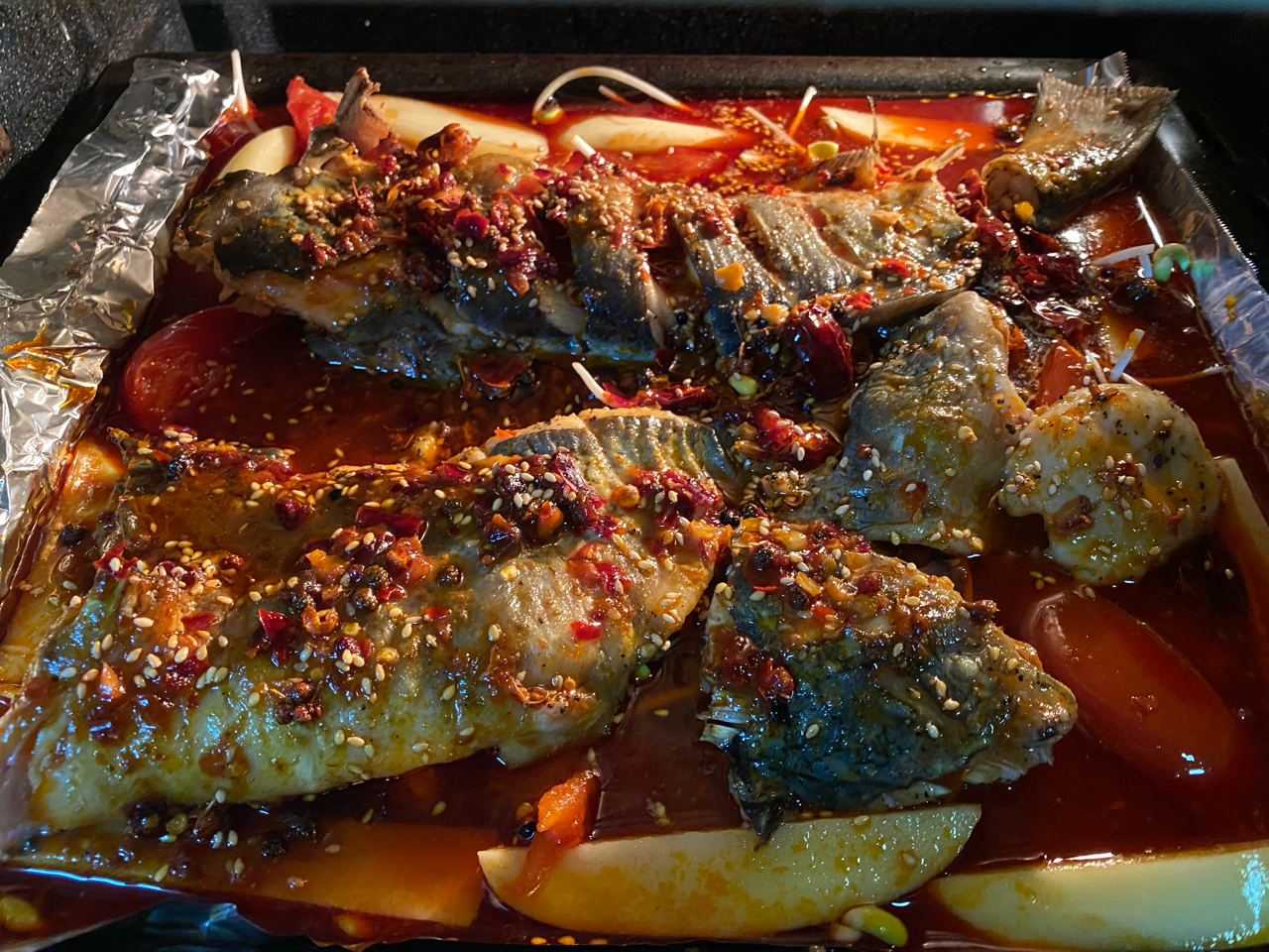 所以烤鱼到底怎么做那?这鱼我是先油炸5分钟,然后扔烤箱里200度上下火30分钟的。