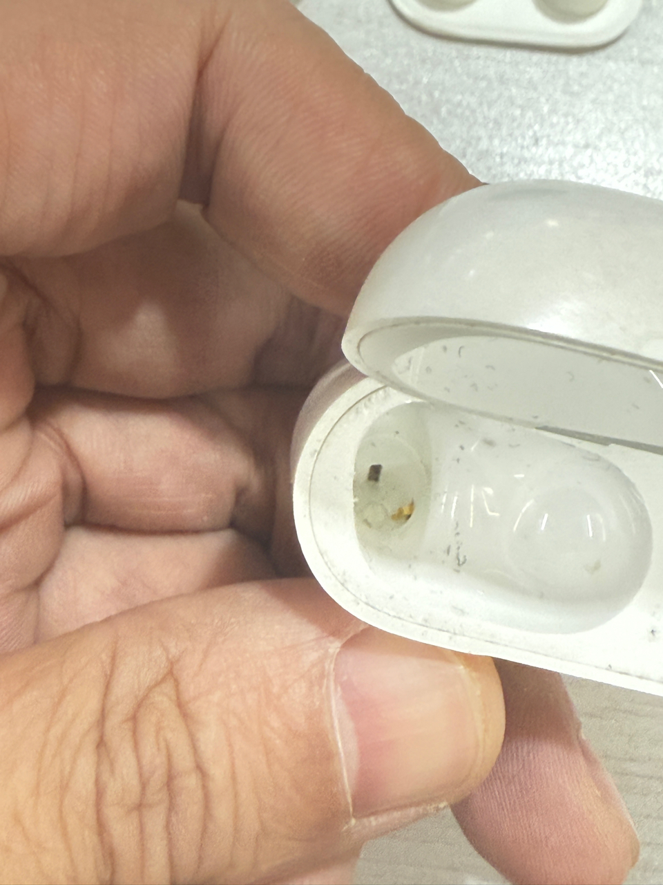 问题:充电盒里面左耳充电触点清灰时被戳进去了,没法给左耳机充电,导致左耳机饿死。故只有右耳可用,充电仓也只有右耳可以充电。
