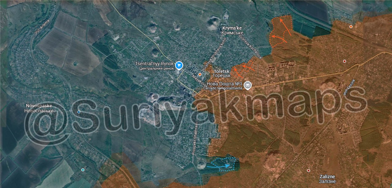 捷尔任斯克,俄军在城东北部推进,而乌军在城南森林附近反攻,战线基本没有重大变化。