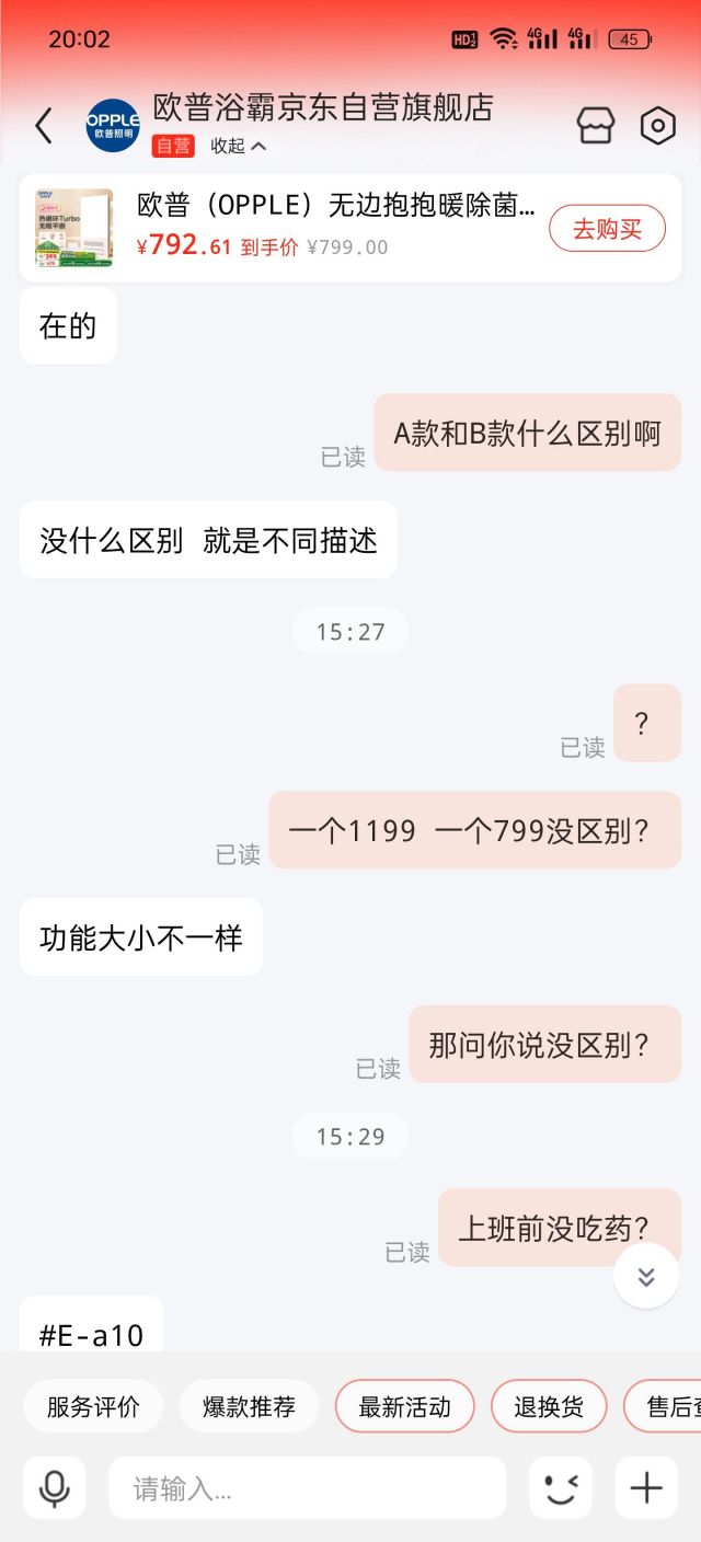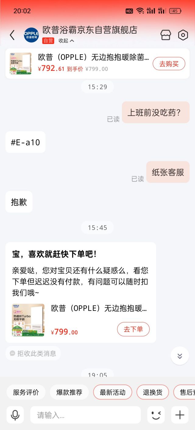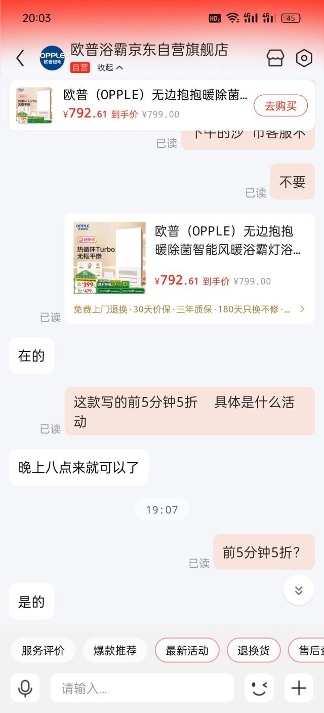 看了个欧普的,发现页面有前几分钟折扣活动,写的模棱两可,估计大概率坑人活动,于是咨询自营店铺客服活动详细信息,RT