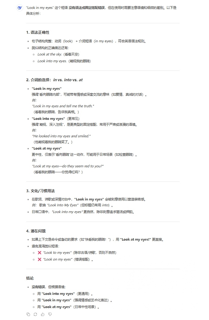 - Look into my eyes :“into” 强调“视线进入眼睛”的动态感 ,更符合英语母语者习惯。带有更深情感色彩 ,常用于浪漫或深情语境 ,像表白场景 “Look into my eyes and tell me you love me.”