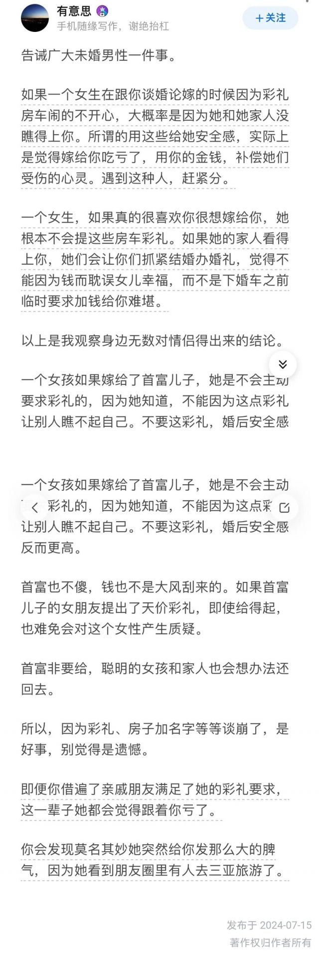 简述贴主有800万,女的要十几万彩礼,妈给的嫁妆彩礼都不带回当保证,楼主让大家出主意