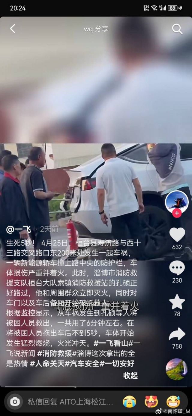 和问界情节差不多,碰撞后起火打不开车门,唯一区别就是正好碰到消防员把人救出来了,现在基本上搜不到,抖音之前有个哥们发的视频还被删了,现在我在抖音上搜只能搜到一条相关。特斯拉还得和华为多学习啊,捂嘴不如华为,你看华为捂嘴悟到人尽皆知