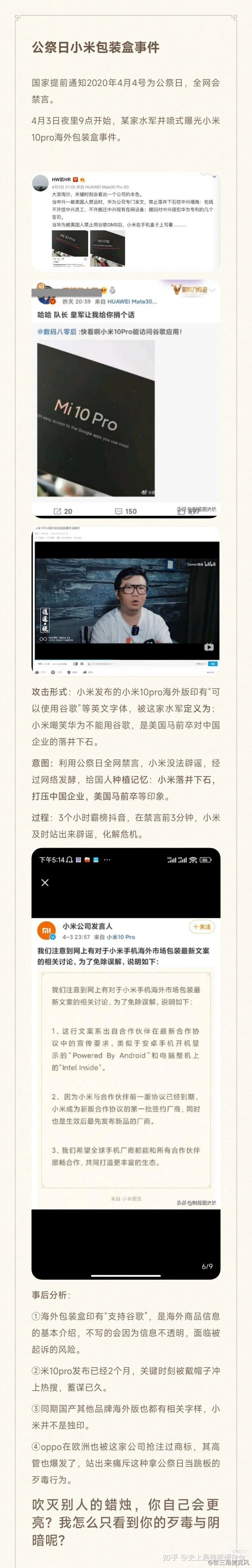 都不用说什么pocket翻大车京东删评,举报指出p10疏油层问题的up的公众号了,光一手抢在国家公祭日前一晚攻击猴米勾结谷歌不让菊花牌用GMS的操作,就值得各位细品一番了。两个小时内,猴米勾结谷歌不让菊花牌用GMS的通稿,配上猴米海外版包装盒的截图就传遍全网,不是猴米反应快晚上9点多发博澄清,卖国贼这个帽子就戴的更牢了。最乐的是vivo,oppo高管还出来帮忙澄清,看来小米帮理想出招应对mega舆情也很好理解了,毕竟自己实实在在淋过雨