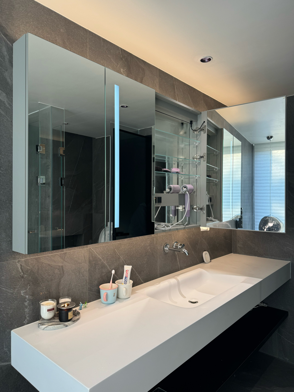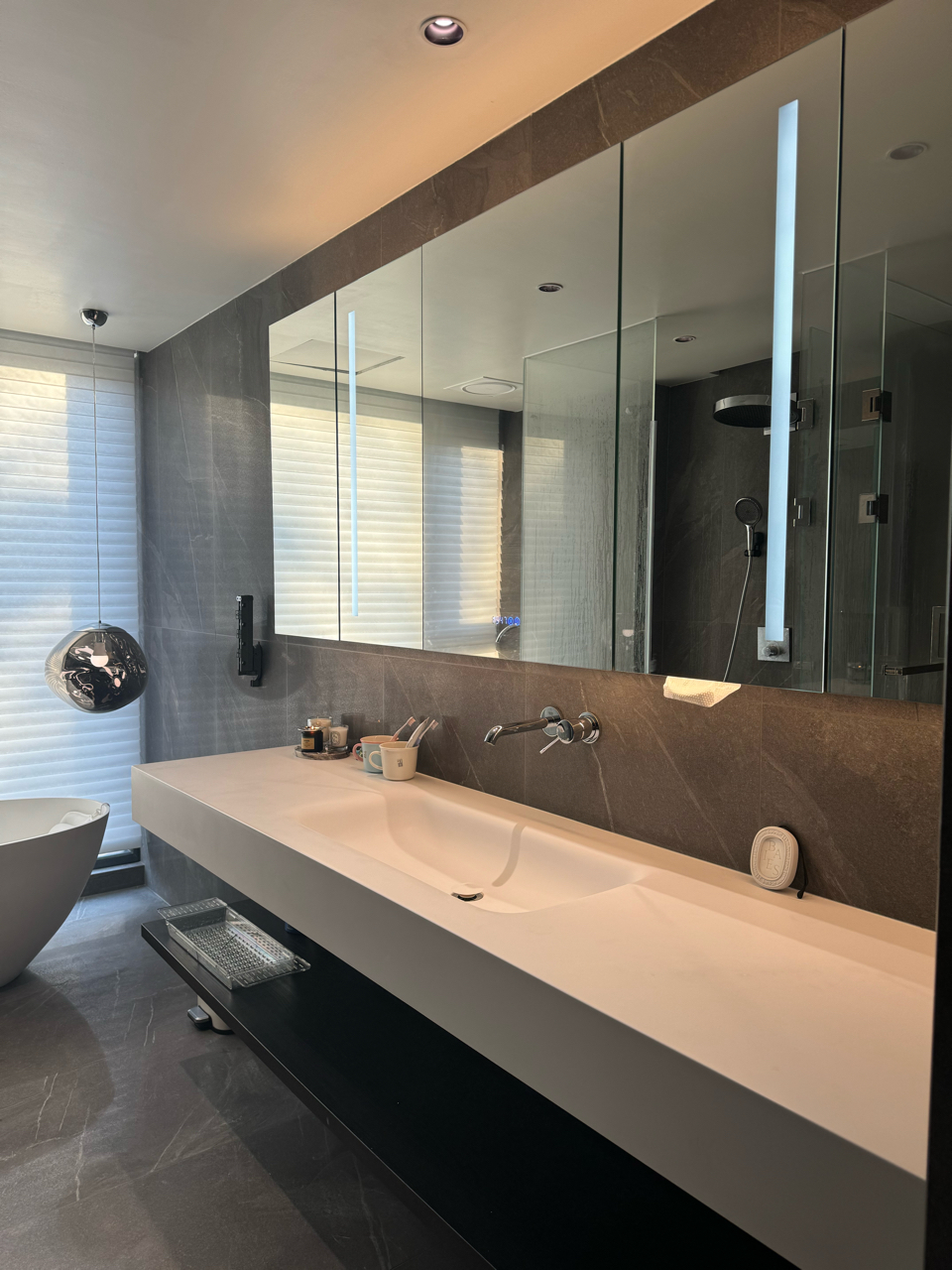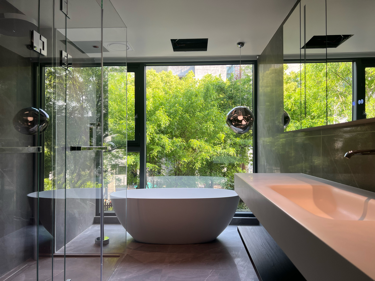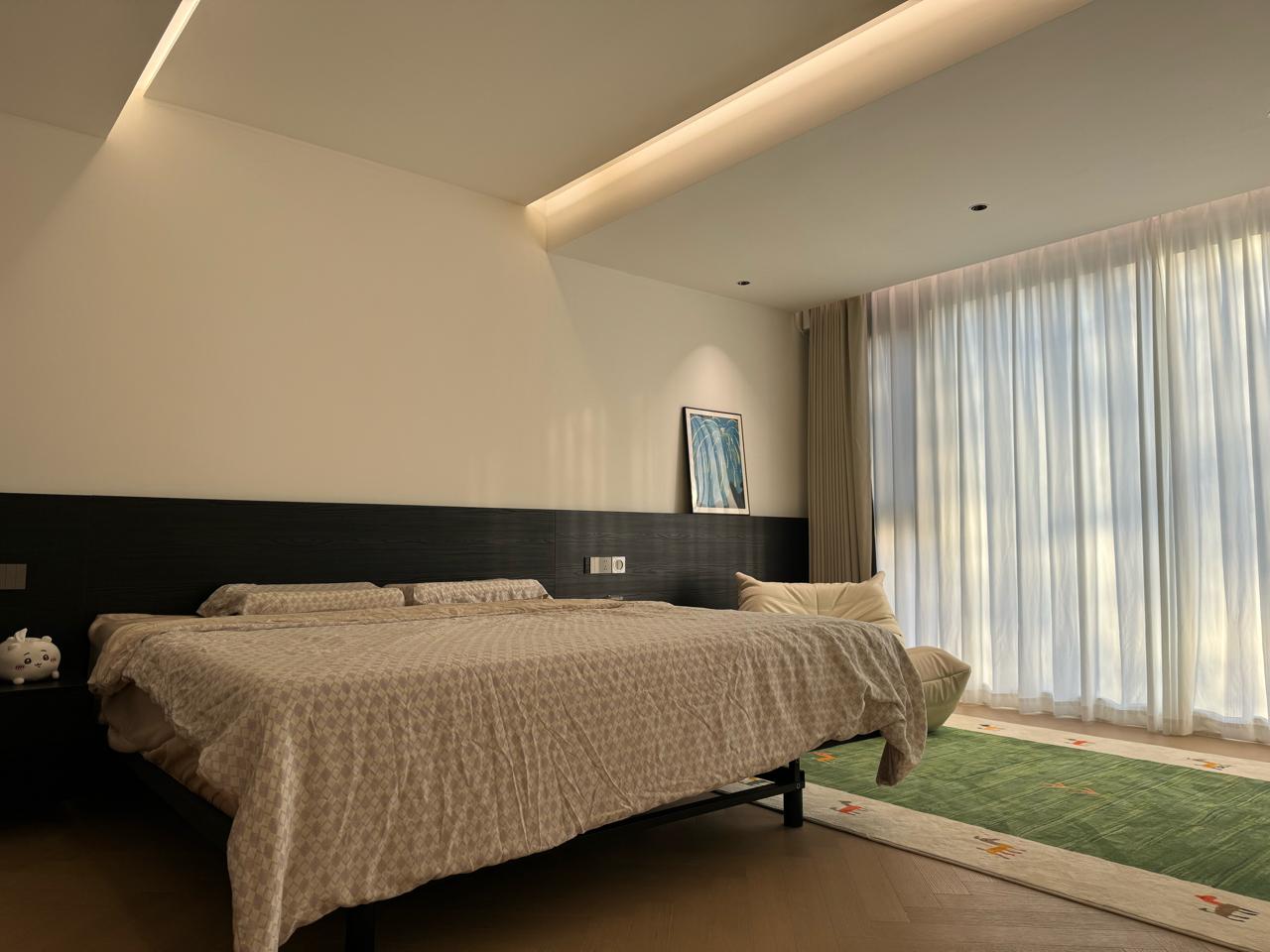 石膏壁灯,自己设计安装的净水软水,境雨360,浴缸,瓷砖通铺的过门石和下沉淋浴区,自己定玻璃五金和预埋型材的无边框淋浴间,外平内开卧室门和油砂玻璃门,水电线全部隐藏的智能马桶,全屋石膏板吊顶,厨房的珐琅板,海淘的三眼灶和室外燃热,中岛台(家庭调酒小吧),三星壁画电视,全屋智能ha、hk,google nest温控器,独立的机柜,电竞房,模型工作间,展示柜,natuzzi沙发,预埋了7.1.4线的家庭影院等等,不少都是现在红薯上比较热门的设计,很多其实都多多少少会有点翻车和返工才搞好的,我尽量说点自己的经验,大家有什么想问的也可以问
