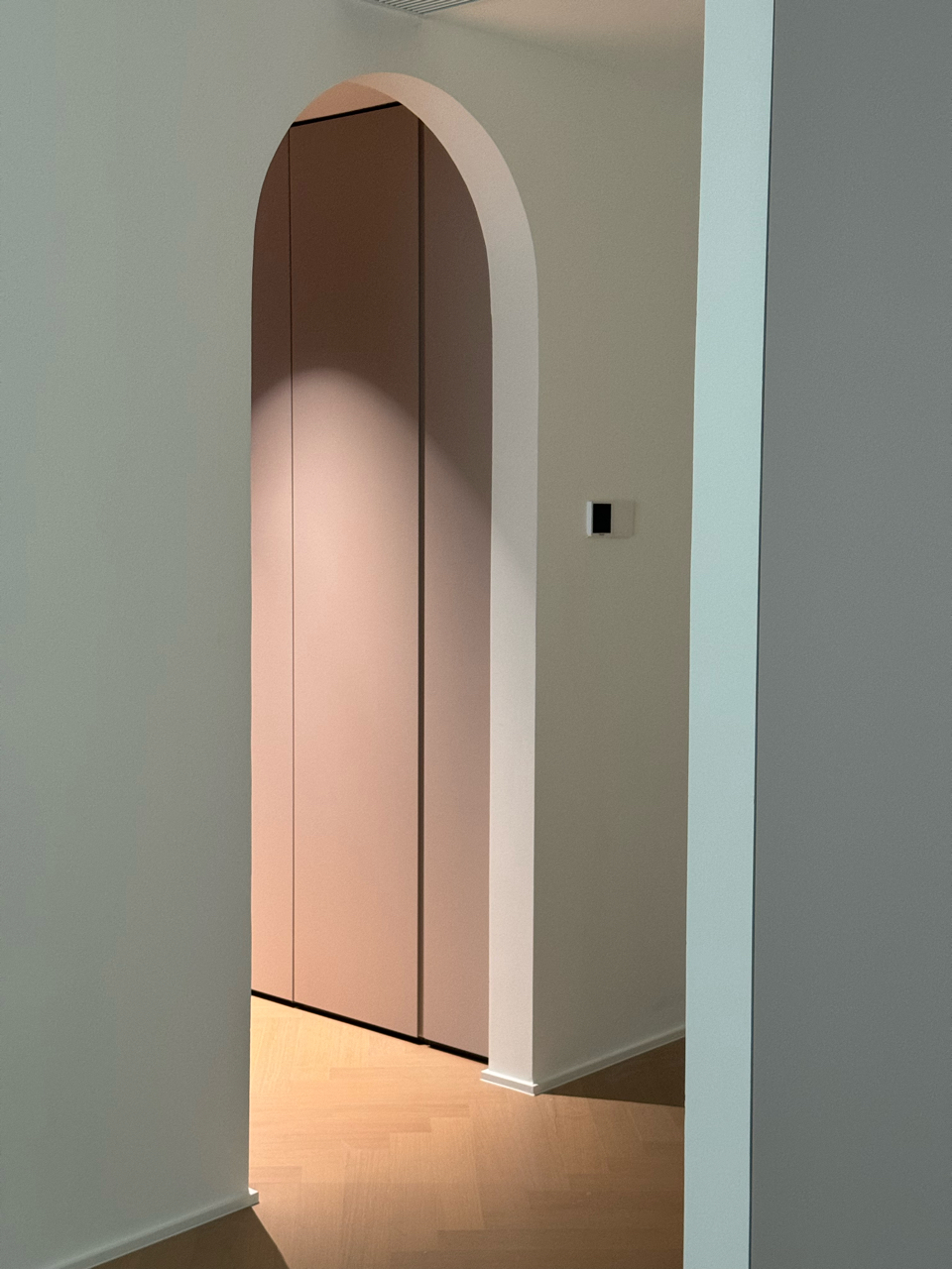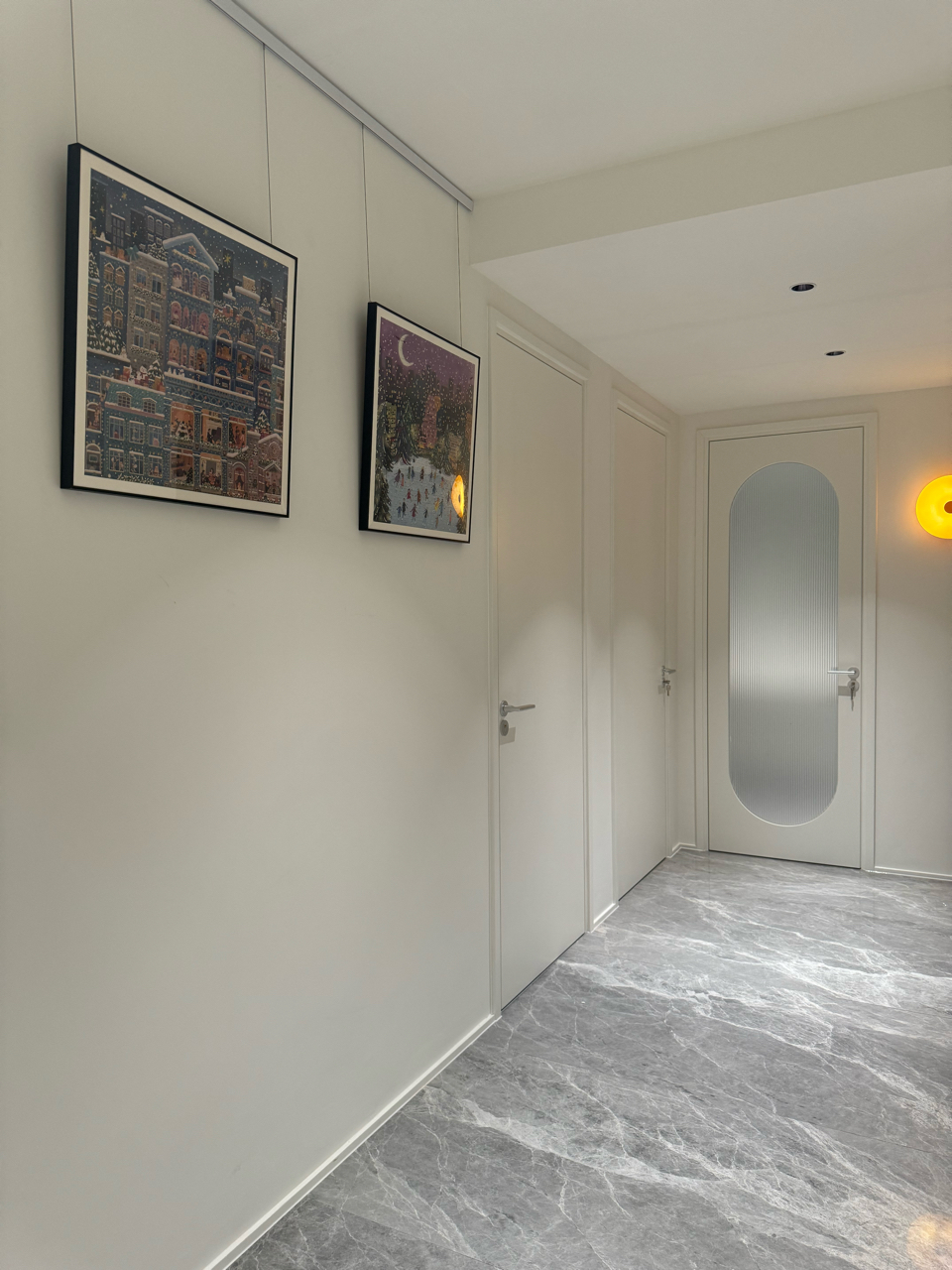 玄关,外平内开的油砂玻璃门,效果还不错,google nest温控器和ipad上墙,纯粹为了颜值买单